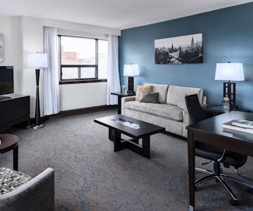 This suite features a living room, a private bedroom, and a kitchen with a refrigerator and microwave. The bedroom includes 2 queen beds, and the living room has a sofa bed. Amenities include a flat-screen cable TV, a Keurig coffee maker, and deluxe toiletries. The room rate is based on 2 guests.